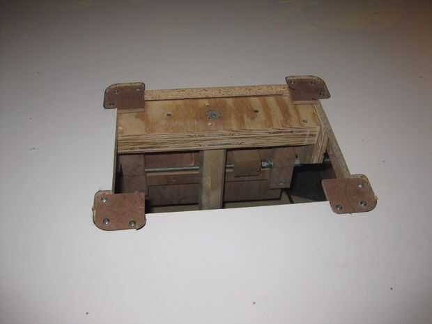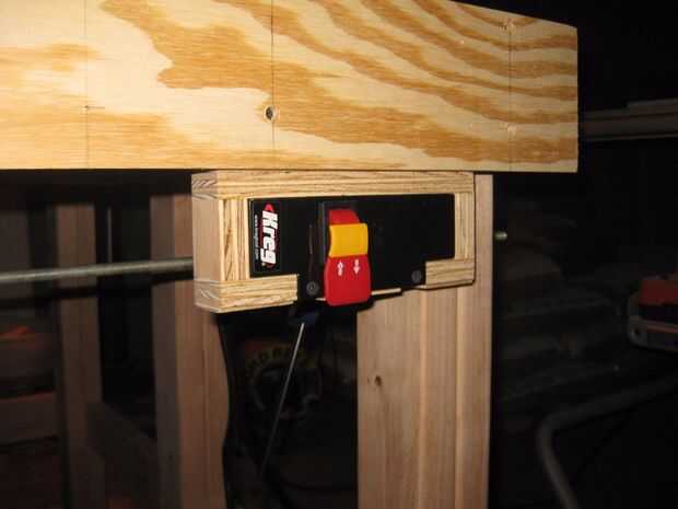 El interruptor de Kreg compré tenía opción para el montaje de la parte inferior... y no había manera que iba a hacer la mortaja fuera una cavidad para a través de la madera contrachapada de 3/4" y el respaldo 2 x 4. En cambio, hice un ajuste caja de placa de madera contrachapada. Que la placa de ajuste consiguió atornillada en la parte inferior de la mesa y tiene el interruptor.
