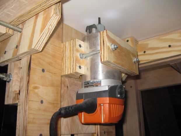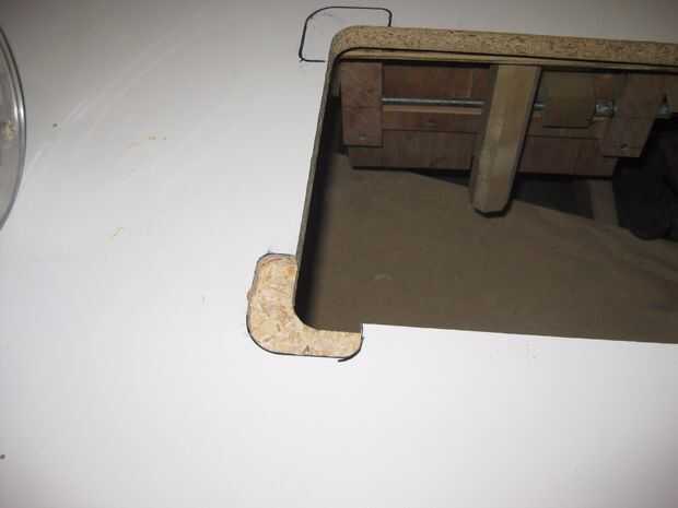 Solución: Hice mis propio soportes esquineros de madera con la lijadora de banda Sierra de cinta y oscilante. Les até con epoxi y tres tornillos cada uno. Entonces tuvo que añadir algunas cuñas de cartón antes de les en el lugar para hacer más espacio para el lugar de router, para que no era orgulloso de la melamina en la parte superior. Yo estaba preocupado que comban o se romper a tiempo, pero no lo han hecho.