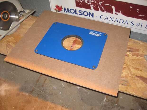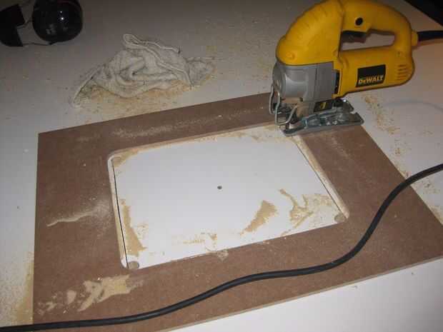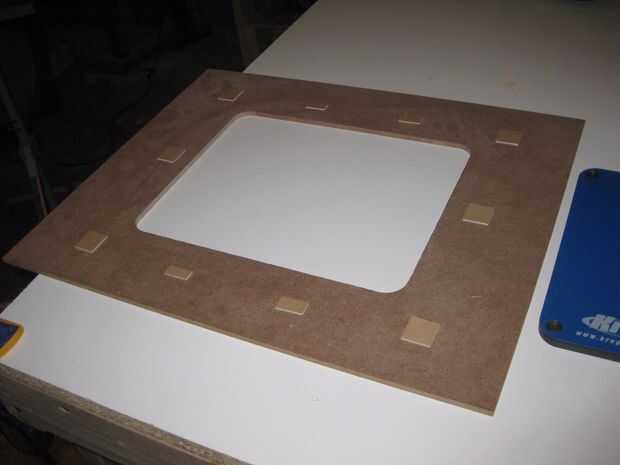 Un agujero fue perforado en cada esquina y luego la mayor parte del material fue quitada usando una sierra de calar. A continuación, se utilizó una broca de recorte al ras para cortar la melamina al ras de la plantilla de madera. Ordené las esquinas nivelación con la placa de router de Kreg, que generalmente sólo sujetar a la base de la mesa de fresadora.