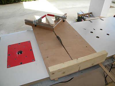 El trineo de inglete construir se basa en el aluminio de las marcas David uno y está hecho básicamente de madera contrachapada y algunos restos de madera de pino. Las pistas de la T son de rieles de cortina de aluminio (probarlos funcionan perfecto) y 2 bajadas de retención metálicas y un bloque de tope completan el proyecto. Perfecto 45 º ingletes cada vez.