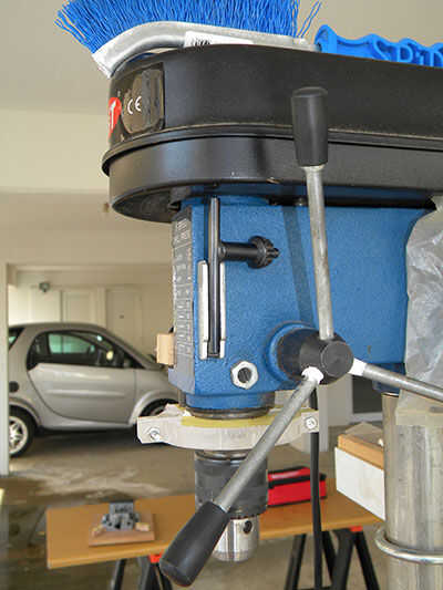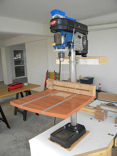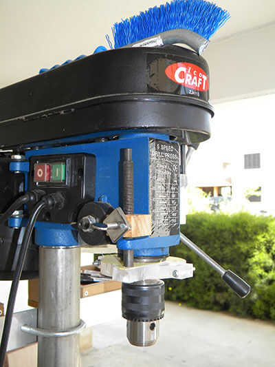 También he hecho una mesa del taladro de una antigua oficina de dejar de lado junto a una valla de madera que gira en un punto y un bloque de tope. Algunas abrazaderas de sujeción casera en las dos pistas de T que no son más que simples cortinas rieles de aluminio. La mesa del taladro tiene dos 1/4 (6mm) placa inserta en la parte superior unos a otros, uno tiene la abertura de agujero de taladro estándar y la segunda placa de un agujero más grande para mi lijadoras de eje de taladro. Otro accesorio que hice para mi taladro era poner sobre la mesa del taladro una pieza de contrachapado con dos perillas caseras aferrarse a las pistas de la t y mi vice taladro montado en él. El antiguo sistema de tope de profundidad con las 2 tuercas fue tan desagradable de usar, por lo que se me ocurrió una manera más fácil de solucionar este problema. Un pequeño trozo de madera dura y una base con un botón pequeño, hierro roscada hecho el tope de profundidad ahora muy fácil de ajustar y usar. Entonces reemplazar el anillo de profundidad de plástico roto con una hecha de acrílico transparente de 3/8. Dos imanes uno sostiene el portabrocas del taladro siempre en el lugar correcto así que no pierdo lo cada vez y el otro en la superior tiene mi poco plástico, cepillo de limpieza.