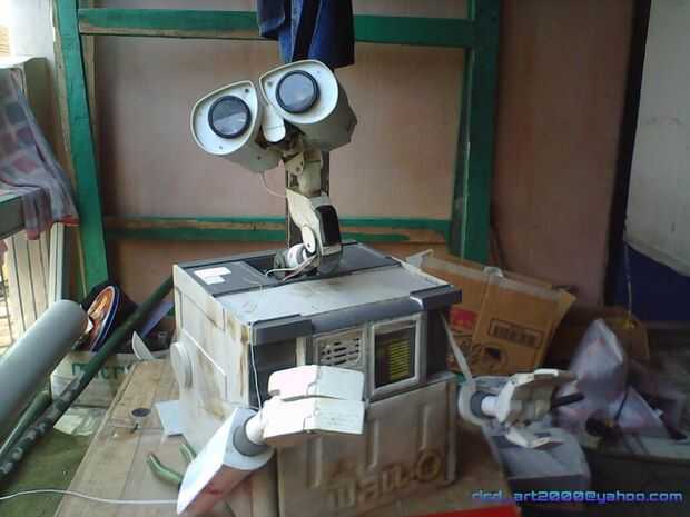 Después de todo el cuerpo y la cabeza combinada, me puso un sistema de sonido con reproductor de mp3 y un archivo de sonido efecto de sonido wall.e y al controlador de todo motor im con 4 módulo de transmisor y receptor RC coches de diferentes frecuencias. Este wall.e usando 11 dc poco motor caja de cambios y caja de cambios motor 2 Tor alto, 3 motores caja de cambios en cada mano, motor 3 en cabeza, 2 motor para sistema de hidrolic. y 2 tosr alto motor de la rueda.