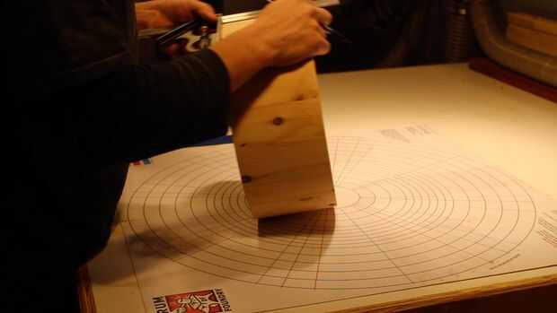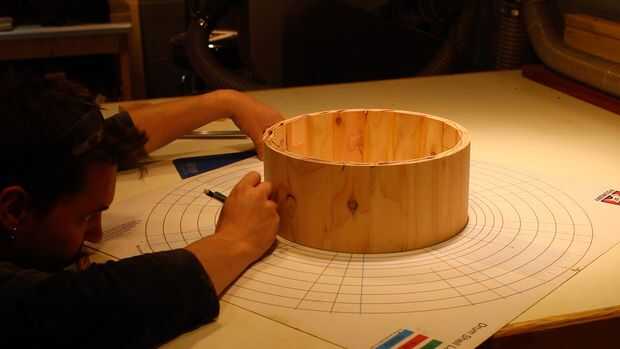 En ubicaciones de hardware de diseño de una cáscara del tambor, tambor constructores se suelen utilizar una alfombra de diseño. Tiene varios círculos concéntricos, que son diámetros de tambor diferente; así como líneas radiales para cantidades diversos lug (6, 8, 10, 12), las piernas, espuelas, etc.. La cáscara se centra en la estera y las líneas deseadas se transfieren a la cáscara. En nuestro caso, hemos transferido para 6 terminales, un filtro (centrado en el entre dos terminales) y una cantonera (centrado en el entre las dos zapatas + directamente opuesto a la ubicación del filtro).