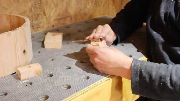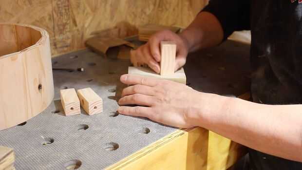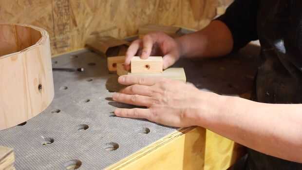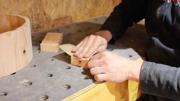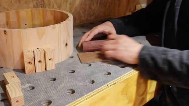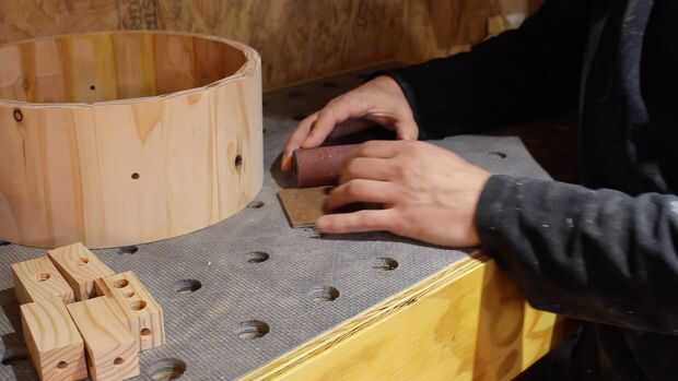 El contorno se lija en la parte posterior de las lengüetas con algunos de los grandes tambores de la OSS y de madera prensada calza hasta mantener centrado en el tambor. Fueron rotas todas las esquinas afiladas y bordes de las zapatas, colador y cantonera, con grano 100 y general se lija grano hasta 220.