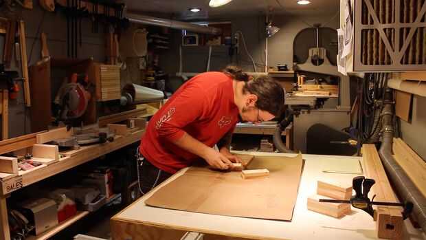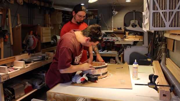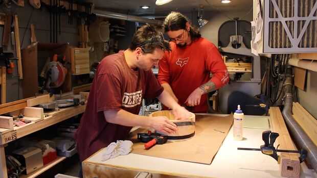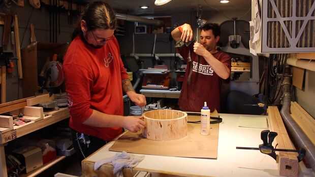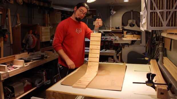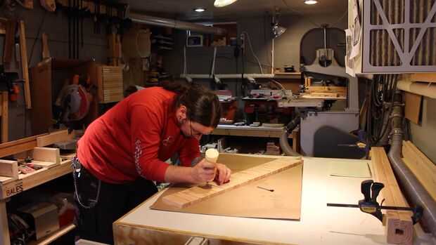 Pegamento es aplicado y entre cada lámina con un cepillo de ácido, se enrolla la pista, unas abrazaderas de banda aplicada y el exceso de pegamento apretón hacia fuera limpiado con un trapo húmedo.