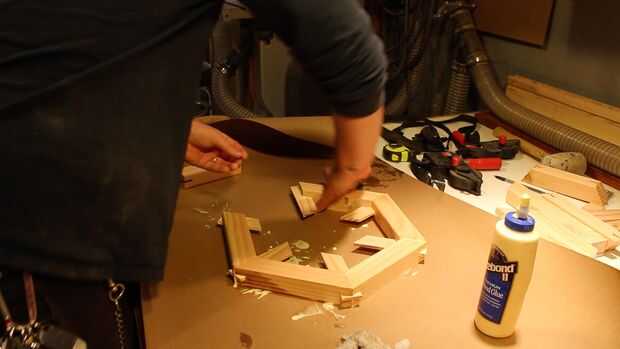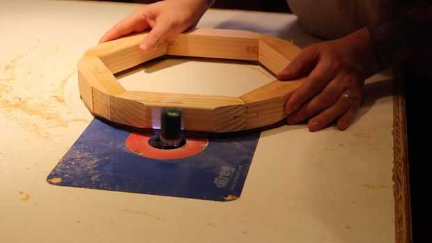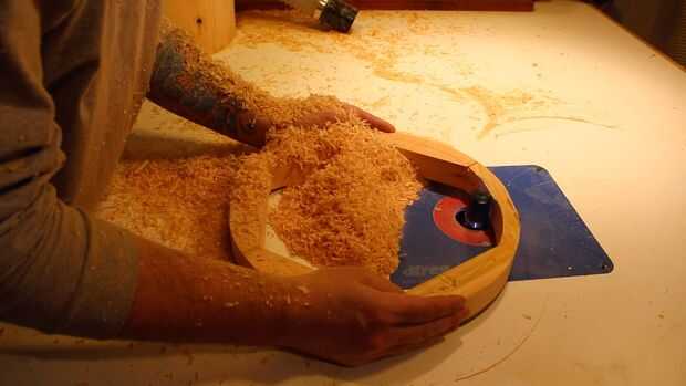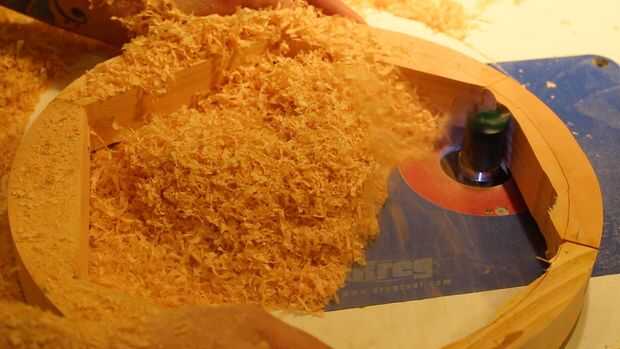 Para convertir este hexágono en un círculo, se utilizó una plantilla de cartón atada con cinta de la alfombra y un poco de patrón en la mesa de fresadora. Hizo un tremendo lío, pero consiguió el trabajo. Fue a tomar su tiempo y pequeños pasos.