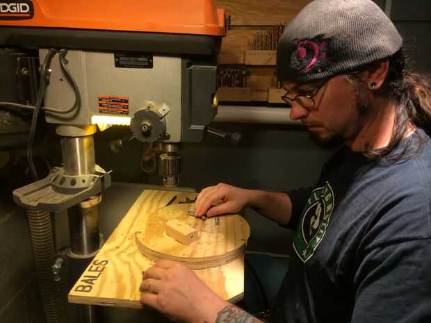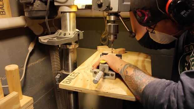 Cada estirón está asegurado en la cáscara con un perno de 1/4-20 centro. Centro fue encontrado en la parte delantera de la oreja trazando las diagonales y mediante la intersección. Un pedacito de Forstner fue utilizado para perforar un agujero amplio y lo suficientemente profundo para avellanar la cabeza del perno. El agujero fue perforado entonces el resto de la manera a través con un 1/4" bits.
