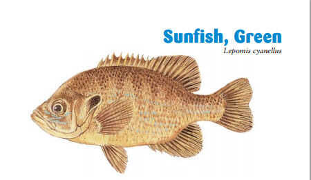 El pez del sol verde es un miembro de la familia Centrarchidae generalizado y comúnmente capturado. Tiene carne blanca, escamosa y es un buen pescado de la comida. Identificación. El pez del sol verde tiene un cuerpo delgado y grueso; un hocico bastante largo; y una boca grande, con la mandíbula superior que se extiende debajo de la pupila del ojo; se asemeja a la warmouth y la lobina. Tiene aletas pectorales cortas, redondeadas, conectadas aletas dorsales y una tapa branquial extendida o "lóbulo de la oreja," que es negro y tiene un borde rojo, rosa o amarillo claro. El cuerpo es generalmente marrón a verde azulado o verde oliva con un bronce de brillo de color verde esmeralda, pérdida de color verde amarillo en la parte inferior laterales y amarillo o blanco en el vientre. Un pez adulto tiene una gran mancha negra en la parte posterior de la segunda dorsal y las aleta anal las bases, y machos reproductores tienen bordes amarillos o naranja en la segunda dorsal, la caudal y las aletas anales. Tamaño. La duración promedio es de 4 pulgadas, que van generalmente de 2 a 8 pulgadas y alcanzando un máximo de 12 pulgadas, que es extremadamente raro. La mayoría pesa menos de media libra. El récord mundial es un pez de 2 libras, 2 onzas tomado en Missouri en 1971.