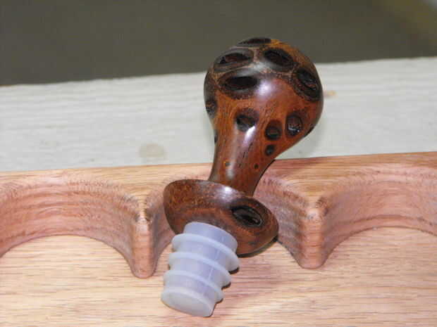 Tapón de la botella de Banksia Pod dado vuelta en un torno de madera con marcas tradicionales, pero esto sería un momento excelente para romper los carburos.