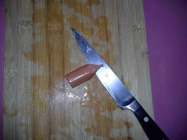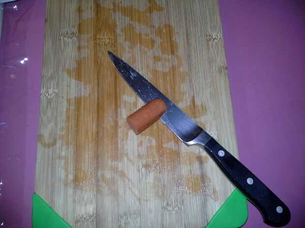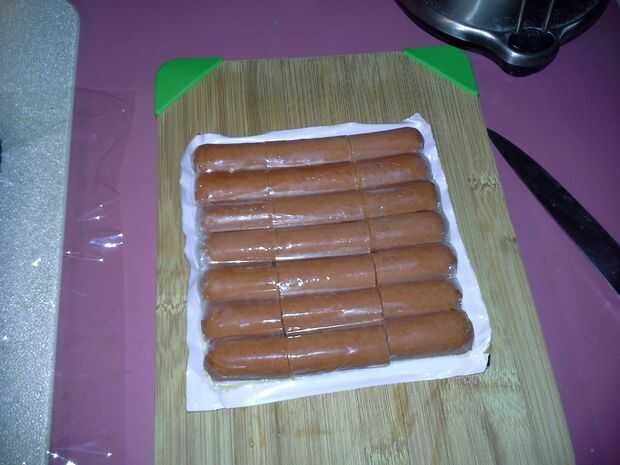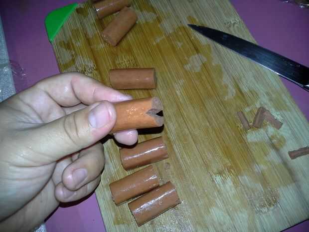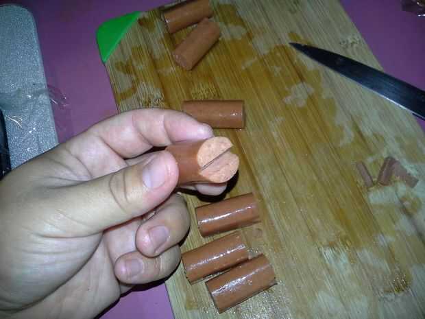 Ahora para la última pieza del rompecabezas, cortar a los perros. Opté por usar carne francos por hebreo nacional porque responden a una autoridad superior... risa. Corté todo el paquete en tercios para formar la cabeza, cola y pies. Lo hice simplemente porque necesitaba dos veces tantos pies como necesitaba cabezas y colas. Adicional, ya que le talla los extremos de la cabeza cola, un extremo de la fábrica no era necesario. Para referencia futura, no cortaré diseños poco tontos en las salchichas la próxima vez. Las caras que cortado meticulosamente en las cabezas y los puntos finamente sintonizados de las colas eran solamente perceptibles en el producto precocido. No estoy diciendo que no podría hacer hacia fuera de la boca o la cola puntiaguda, pero la cantidad de esfuerzo adicional era innecesaria. Ya que mi principal preocupación era el resultado final, me encontré con la parte posterior de este paso a ser una pérdida de tiempo. Sin embargo, si el espíritu le mueve, noquear a ti mismo. Para los pies, hice una sola rebanada en una pieza de extremo 1,5 pulgadas de profundidad. La cabeza tenía un trozo en forma de v eliminado y dos cortes poco profundos, perpendiculares a la muesca en v, para los ojos. Por último, la cola se redujo a un punto y cada pila de piezas fue embolsado por separado para acelerar la Asamblea al día siguiente.