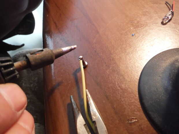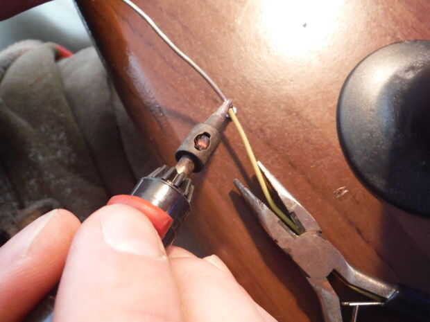 En primer lugar usted necesita fijar el cable con el conector positivo en el 510. Hale el pasador de la caja de enchufe y retire cuidadosamente el aislante de goma. Ahora mis conocimientos de soldaduras no son los más grandes así que encontrar la mejor manera de fijarlo es usar flujo de soldadura separada para el trabajo, en lugar de núcleo de fundente que se puede cargar para arriba en el flujo sí mismo. Empezar poniendo un poco de flujo en el extremo del perno y en el extremo de su cable, entonces gotea una gota de soldadura en la espiga. Utilice un soplete de butano para calentar el pin que se dibujará la soldadura en el agujero y rápidamente, antes de que se enfríe Inserte el cable. Esto hace una conexión muy fuerte. Ahora puede volver a instalar en el conector con su aislante.