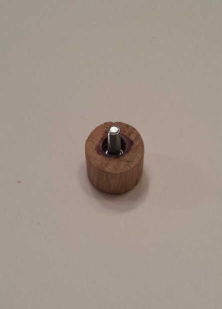 Para solucionar la debilidad estética, he hecho fundas para los tornillos. Los "casquillos" se hacen de la misma varilla de pasador como mango. La tapa es ½" de largo y la parte inferior ¼". Utilizando la misma técnica como cuando el mango de la perforación, hizo un agujero en cada tapa, de profundidad suficiente para que el tornillo de aproximadamente la mitad se extiende más allá del extremo de la tapa. La longitud del tornillo dependerá de lo que tienes en la mano, pero tendrás uno más corto para la tapa inferior, lo que hacen por la parte superior. Al perforar los agujeros de este tiempo, usted definitivamente querrá hacer un agujero piloto. También, a hacer un agujero más grande, para que toda la cabeza del tornillo se encajan. En mi caso, el tornillo de cabeza de pan cabe cómodamente dentro de un agujero de 11/32".