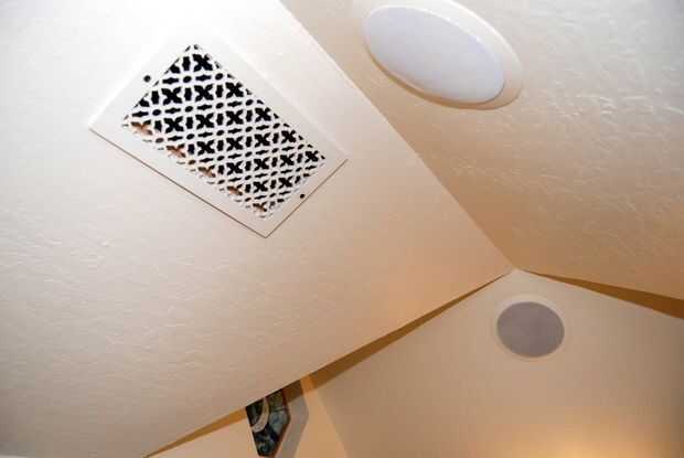 Recogí los altavoces de techo en la pared de www.hometech.com que no eran demasiado caros ($80) y el sonido bastante bueno. Las rejillas de altavoz son se puede pintar para mimetizarse con el techo.
