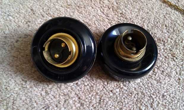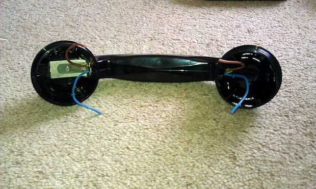 Compré dos sostenedores de bulbo de latón y funcionó dos cables en el auricular inalámbrico para conectarlos. Estos a su vez luego fueron conectados a las conexiones originales de la lámpara de la mesilla. La boca y el auricular fueron cortadas para que los sostenedores de bulbo podrían ser encajan perfectamente (disculpas por la falta de fotos).