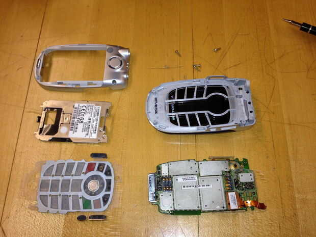 El siguiente paso es quitar la placa de circuito y el teclado de plástico. Para quitar la placa de circuito simplemente saque la placa del teléfono. El teclado será tan sencillo y fácilmente levanta el teléfono. No deseche la placa de circuito o el teclado. La quinta foto muestra todas las piezas que necesitan ser removidas desde el teléfono.