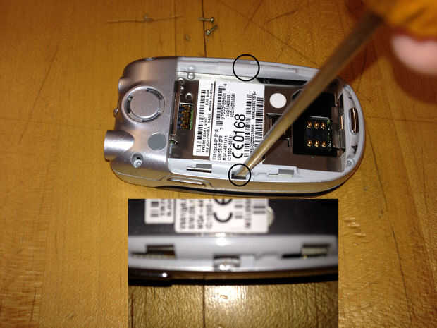 Utilizar un pequeño flathead destornillador para destrabar los dos clips de celebración de las dos partes del teléfono, como se muestra en la tercera foto. Que retire la parte posterior del teléfono.