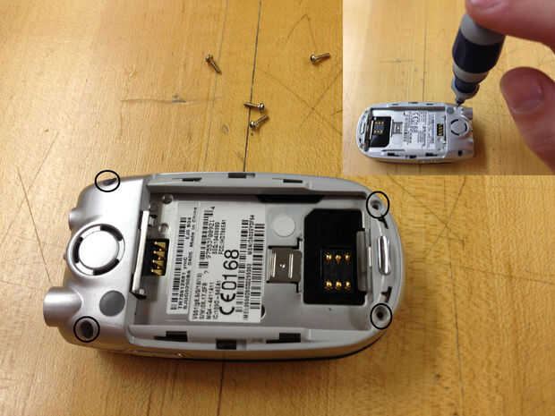 A continuación Desatornille los cuatro tornillos en la parte posterior de la caja del teléfono como un círculo en la segunda foto. Conserve los cuatro tornillos.