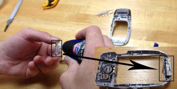 Muy similar al paso anterior, utilice el conector de alimentación que se ha quitado previamente de la placa de circuito. El conector de alimentación y aplique una pequeña cantidad de pegamento en un lado. Que el lugar de conector de alimentación en la parte inferior exterior del plástico de la caja del teléfono como se muestra en la tercera foto. Este paso también ayudará el teléfono externo mantenga su información y el contenido del teléfono de caer de la caja.