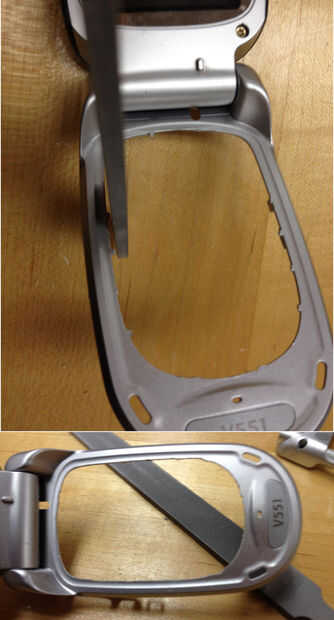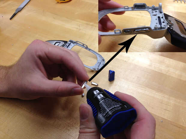 El siguiente paso es tomar los botones del teclado de tres que se retiraron desde el teclado y pegar en el teléfono. Toma el pegamento y poner una pequeña cantidad de pegamento alrededor del borde del botón. Lugar el botón de plástico en su agujero señalado en el lado de la caja del teléfono. Paso que se muestra en la segunda foto. Repita esto para cada uno de los tres botones de quitados. Este paso evitará el teléfono externo que sus detalles y el contenido del teléfono fuera de la caja.