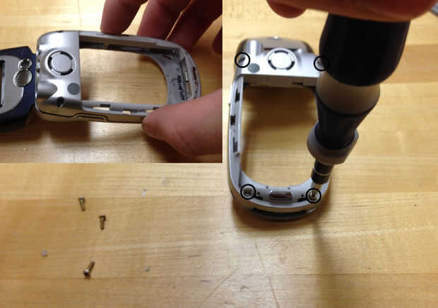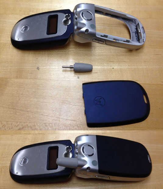 Que toma la antena y el tornillo en el agujero de la antena en la parte superior del teléfono. El último es el plástico azul tapa de la batería externa se ha deslizado en la parte posterior del teléfono. Estos pasos se muestran en la segunda foto.