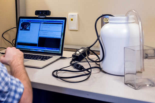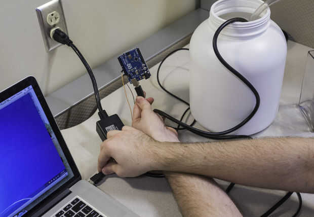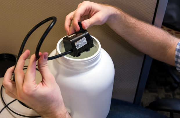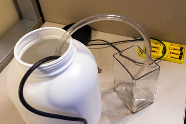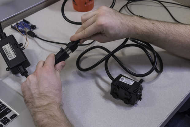 Estamos controlando la bomba de agua a través el PowerSwitch para cola II dando y quitando poder al Arduino, señales para configurar la bomba de agua es muy fácil. En primer lugar, coloque la bomba de agua para el ajuste más bajo si se utiliza la misma bomba como lo hicimos, de lo contrario bombea agua demasiado rápido. Luego, enchufe en el PowerSwitch para cola II y conecte el tubo de plástico, asegurándose de que el tubo puede llegar al conector de recepción. Por último, coloque la bomba de agua en el receptáculo de la celebración con el agua.