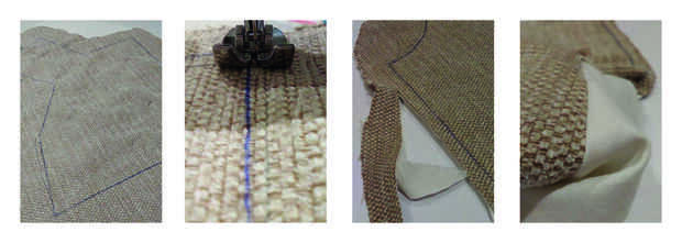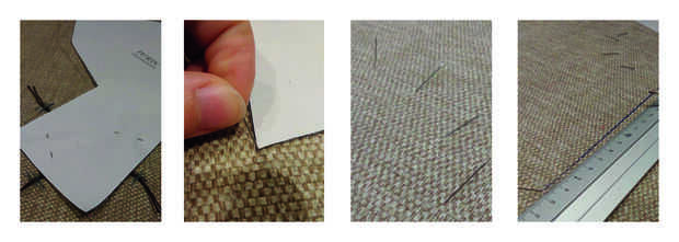 Tenemos que tener la forma del patrón al otro lado de la tela. Lo más precioso para hacer esto, es con los pernos. Perno en cada esquina de la forma de un alfiler. De esta manera puede conectar todas las esquinas en la parte trasera con un lápiz, y tendrá la forma del patrón en el lado derecho.