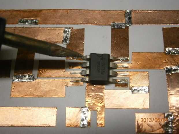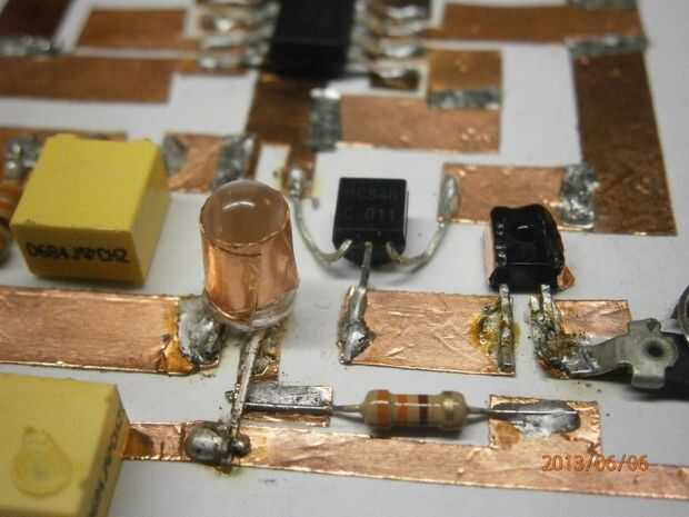 a soldar los componentes utiliza el lápiz de flujo y más soldadura es un proceso minucioso poco woth el esfuerzo. Como se puede ver, he cambiado el LED IR porque no era lo suficientemente brillante, y no usé la segunda resistencia de 330 ohmios, pero dejé soldada en el circuito.