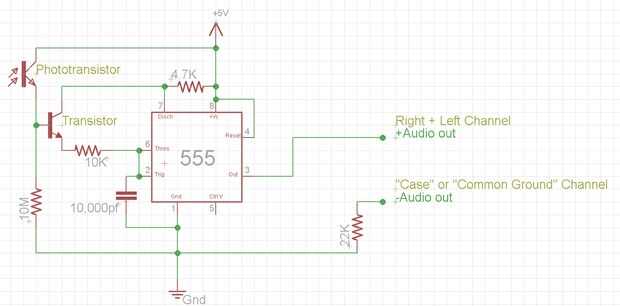 ¿Cómo funciona esto? Tono del Temporizador 555 que crea varía su tono basado en valores de resistencia y condensador. El fototransistor controla cuanta corriente pasa desde el colector del transistor de NPN para el emisor del transistor NPN, tipo de como una resistencia.