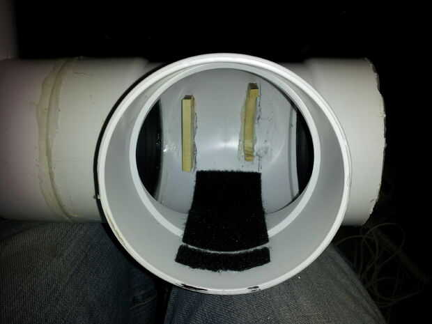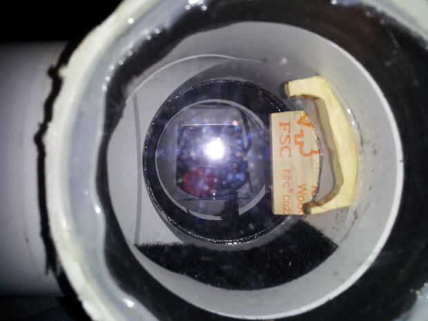 Tomé la lente de mi primer proyecto y recortar un poquito por lo que encajaría dentro de la abertura, en lugar de sentarse en la parte superior de la misma. La tubería de desagüe, decidí hacer el eje principal se ajusta los extremos ensanchados de la "T" y las piezas de codo. Corté una pequeña sección de la tubería para hacer un espaciador en uno de los brazos que había algo más para garantizar el objetivo a.