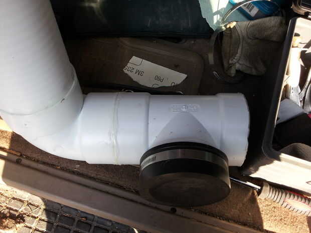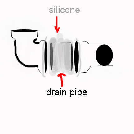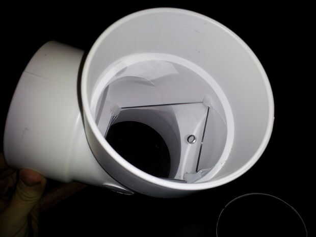 Luego, corté un trozo de la tubería de desagüe para actuar como un acoplador entre la pieza "T" y el codo inferior común. Observar mis locas habilidades de Photoshop. Untó de silicona en toda la pieza de acoplamiento, se deslizó ambos lados, luego siliconada la costura donde la "T" y el codo se reunieron así. Asegúrese de que el pedazo del codo y la "T" son perpendiculares uno al otro. Utilice una superficie plana y un nivel a través de la abertura superior del codo. Yo no hice esto. Mi cámara sólo se sienta un poco raro.
