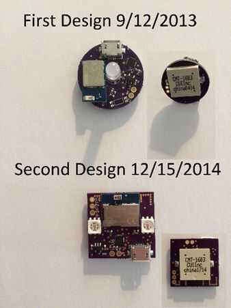 El primer diseño incluye un módulo Bluetooth 4.0 BLE de corto alcance y uno redondo rojo/verde/azul (RGB) LED. El módulo trabajado pero el color no era prominente y la gama fue limitada. El segundo diseño había incluido 2 plano RGB LED y un largo sonó el módulo Bluetooth. Este diseño fue superior lo que permite mucho más conexiones de la estufa, mejor mezcla de luz y brillantes efectos visuales.