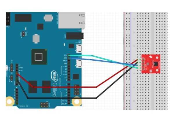 • El sensor HTU21D de temperatura y humedad tiene 4 pines, tierra, voltaje de 3.3 V, SDA (línea de datos serie), SCL (Serial Clock línea), que necesita estar conectado a la Galileo de Intel.