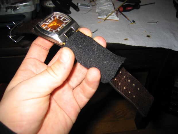 Básicamente sólo envolver alrededor de la banda y la placa de circuito y colocar por debajo. Utilicé un poco de pegamento, pero cuando sustituyo con cuero probablemente a coser a la banda a través de los orificios.