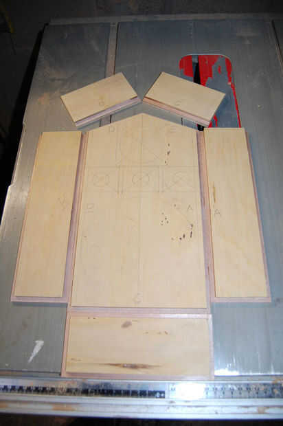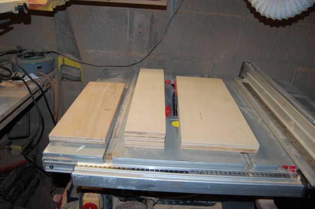 Primero por cortar algunas capas de 12mm en la Sierra de mesa en tiras de 180mm de ancho (frente y reverso) y 70mm de ancho (los bordes). También corté un poco capas de 18 m m en una franja de ancho de 100mm (sombrero)