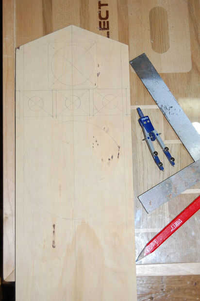 Utilizando una regla/brújula/Plaza, marcada donde mis botones/altavoz/giradiscos se sentaría, y utiliza este sistema de la línea de base. Este corte fue hecho en la Sierra de inglete.
