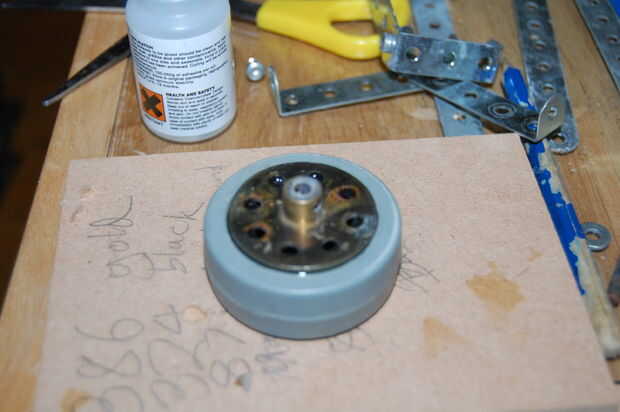 Tuve una pequeña rueda giratoria de goma, y esto transferiría la rotación del eje a la rueda del ratón. Me súper pegado un mecano rueda y la arandela de la rueda de goma y construyó un marco alrededor de ella que bien encajada en el cuadro y se atornilla en lugar.
