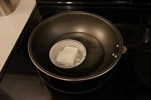 Para cera de una calabaza pequeña (el mío es una calabaza pequeña de color blanco) primero debe derretir una barra de cera. Para hacer esto con seguridad conseguir un bote y llenarlo con suficiente agua para venir a mitad de una lata de pastel pequeño. Poner la olla en la estufa y el calor en el medio. Al mismo tiempo añadir unos 200g (1 barra, desde el paquete que recibí) de parafina a la empanada de la lata y ponerlo en el agua. Esto calentará lentamente la cera sin lo vaporización o haciendo que consigue bastante caliente para quemar. Sin embargo, como siempre cuando uso cualquier cosa caliente PRECAUCIÓN es necesario. Un adulto debe supervisar.