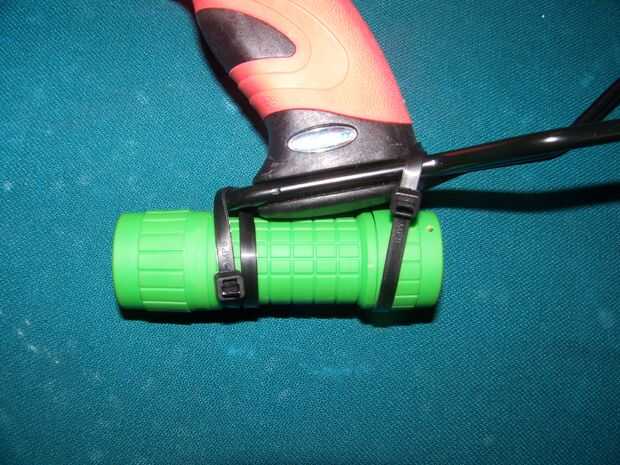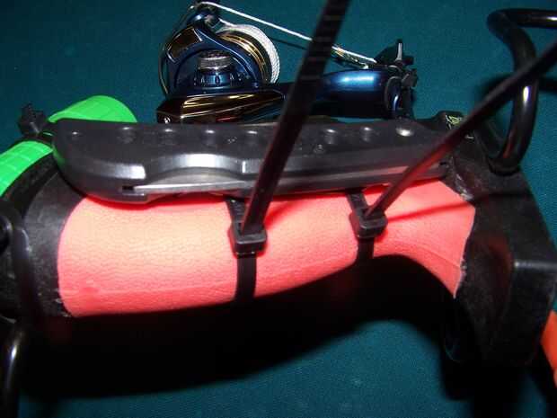 Utilizando 2 abrazaderas de plástico une la cuchilla a través de la pinza para sujetarlo al lado izquierdo de la Honda tiro mango. El cuchillo sólo se levante como lo haría si fuera un cinturón.