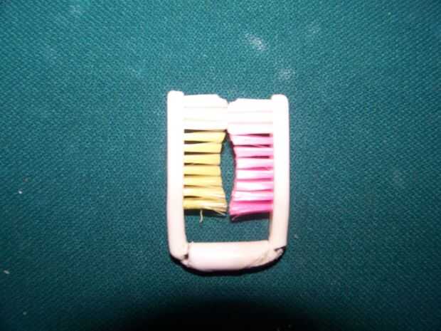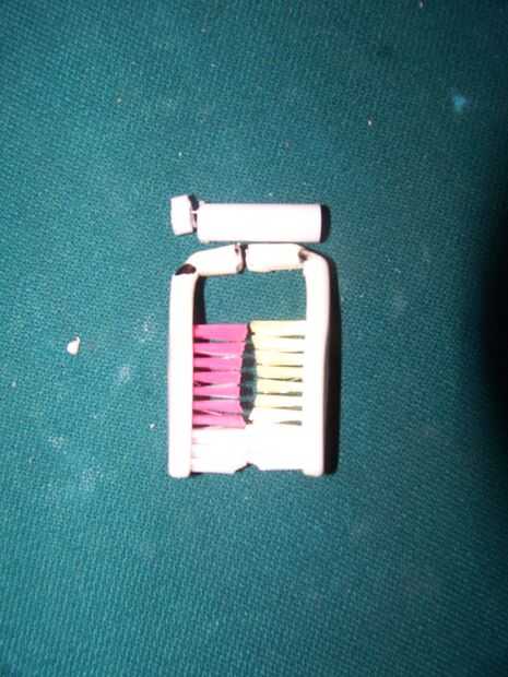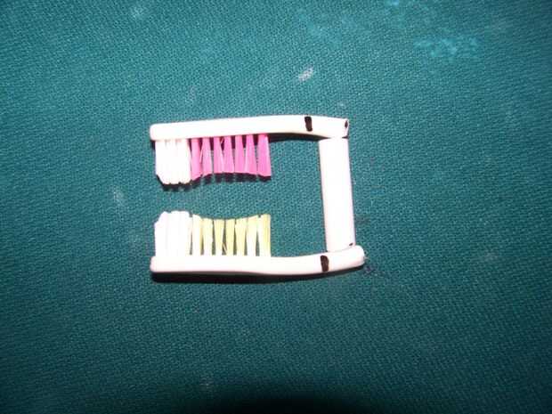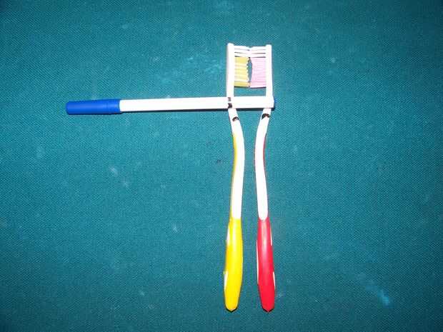 tomar los cepillos de dientes y ponerlos juntos para el toque justo de cerdas Coloque la pluma a través de y marca donde se encuentra con cada cepillo de dientes y a continuación marca la pluma corta cada uno en estas marcas.