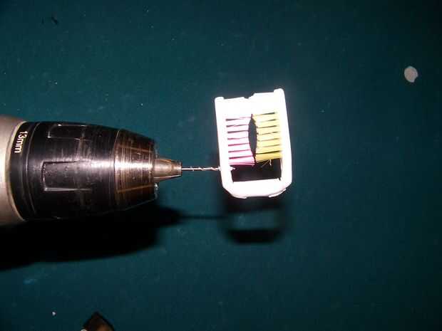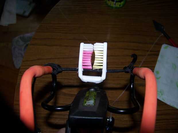 Usando alicates de punta sostenga el cepillo de dientes justo encima el calor de la marca en la marca y cuando es flexible doblar el cepillo de dientes hasta un ángulo de 90 grados. Repita con el cepillo 2. Coloque una pequeña cantidad de pegamento en los extremos de la pluma, luego deslice los cepillos de dientes en tan sólo tocan. Taladrar un agujero piloto pequeño justo debajo de las cerdas luego ampliado a tirar de agujeros de 1/8 de pulgada Para cable a través de estos orificios (encontré este más fácil por los extremos de la cuerda Para la calefacción y tirando a una forma cónica para ayudar a través de los orificios.) amarrar el cable a una de las tarjetas verticales de tiro de Honda y la otra haciendo el cordón apretado. Esto sostenga la flecha en su lugar y es lo suficientemente flexible no para el vuelo de las flechas.