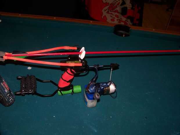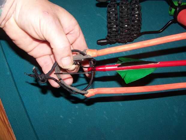 Luego até cable Para a través de la bolsa de la Honda de cuero por lo que todavía se abrirá completamente. Colocar la flecha en la cuerda y tire el nudo en la parte posterior de la médula al centro de la flecha. con ataduras de cremallera pequeño a cada lado de la flecha haces un golpe que será centro de la flecha para disparar. Para disparar a pone la flecha en la cadena y el lugar la flecha en la guía de agarrar el nudo y dibujar, suelte el nudo al fuego. la flecha que utilicé fue solo una flecha del destino me quité la punta y poner en una punta del campo que entonces perforé un agujero pequeño en la parte inferior del punto que el mecanismo de giro podría conectarse para disparar la línea fuera del carrete para recuperar peces o caza menor pero cualquier flecha funciona bien.