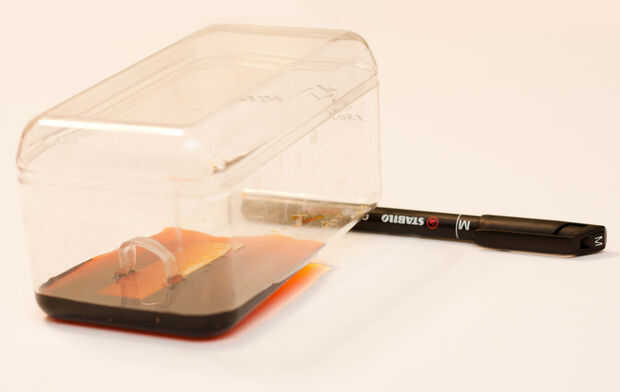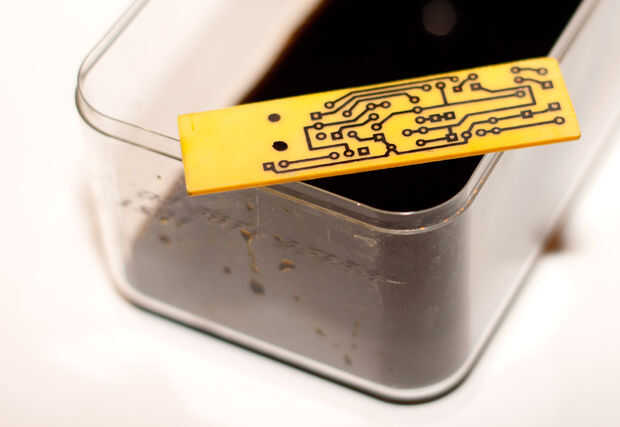 Dip de la pcb en el ácido en un recipiente de plástico y agite cada algunos minutos para remix el fluido y acelerar el proceso. Si el cloruro férrico es inusitado verás pronto algunos cobre oscuro mezclando el ácido y por la solución más oscuro. Su ácido será oscuro y perderá cierta eficacia, así que si usted piensa que el proceso ha tomado demasiado tiempo, la próxima vez use más cloruro férrico.