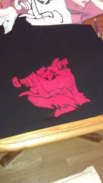 Determiné donde el logo debe estar en el pecho de la túnica y bosquejó el contorno primero. Esto se hizo con un pincel pequeño de estilo de arte. Una vez que tuviera el contorno, rellena todo con pintura roja. En este punto, usted debe poner periódico dentro de la túnica para evitar sangrado a través de. Necesitaba utilizar varias capas de pintura, secado en medio, como mi material estaba muy poroso (pensar mantel). Después de que el contorno se llena de rojo, usé las diferentes crestas y valles como puntos de referencia en el resto de las líneas en negro. Resultó ser mucho más fácil de lo esperado. Los errores que a lo largo de la manera pueden retocarse con la pintura negra.