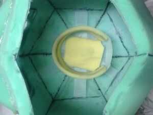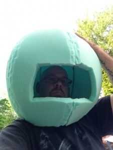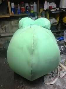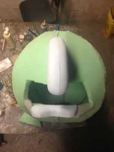 Empecé con una pelota de playa 24″, una pelota de playa es ideal para las cabezas de círculo el patrón ya está establecido para usted! Así que mi siguiente paso era conseguir algunos negra láminas de plástico y empezar a formar hacia fuera de la jaula del"cabeza". Después de formar la "jaula cabeza" ¡ les cosieron y había reforzado con un poco de pegamento caliente! A continuación, cortar alguna espuma de 1 pulgada HD y caliente lo pegado a la "jaula de cabeza", corte una abertura genérica para la boca y BAM, su en su camino.
