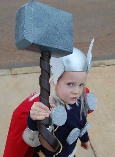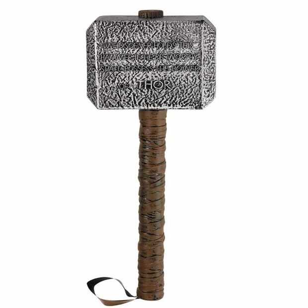 Cuando llegó el martillo, me impresionó lo grande que era. Si recuerdan, compré un licenciado oficial escudo de Capitán América para el traje del año pasado y había aprendido que muchos accesorios de vestuario son de 3/4 escala. No es así, para el martillo de Thor. Esta cosa es tamaño real. Y el agarre era más 2" de diámetro. Mi hijo apenas podía sostenerla. Además, el martillo fue hueco y fácilmente deformados durante el juego de luz. Esto simplemente no haría.