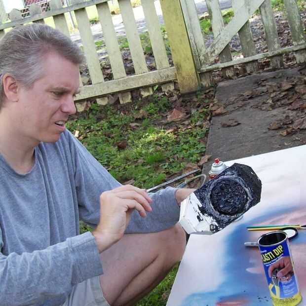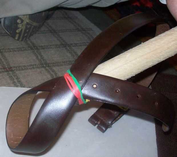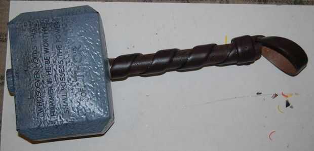 Terminé el martillo por epoxying una tira de brown vinilo torció en espiral alrededor de la manija. Entonces sujetó un lazo hecho de una correa de cuero, a base de la palanca con un tornillo para madera. I cubierto sobre el tornillo con el sobrante de la correa y espiral de la correa hasta la manija, así (asegurándolo con el epóxido más. Después de secar, me quedé con una réplica de plástico altamente personalizada y muy auténtico del famoso martillo de Thor.