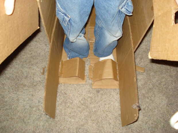 corte a lo largo de un lado de la caja para tan largo como sea posible y plana. poner una aleta y mark fueron sus pies van a ser. luego cortar una línea en el medio donde su muslo por lo que se puede caminar. Luego, ponga un pedazo de cartón sobre los pies (ver foto)