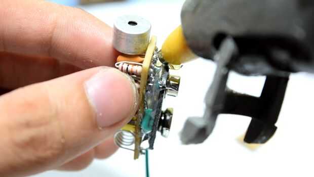 Aplicar una gota generosa de pegamento caliente para unir el clip y el circuito del transmisor.