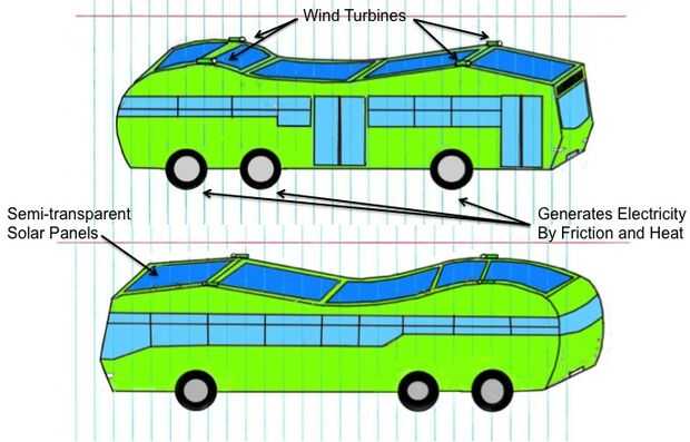 Autobús es un vehículo rápido movimiento significado hay suficiente viento de cabeza para turbinas de energía eólica para generar electricidad. Colocación de turbinas de viento para arriba en la azotea con los paneles solares será costo-eficiente y eficaz porque no es grande por tamaño y el viento pasando a través de las turbinas será lo suficientemente fuerte como para girar las turbinas tan rápidas, generar más electricidad que sus hermanos más grandes para arriba en las montañas.