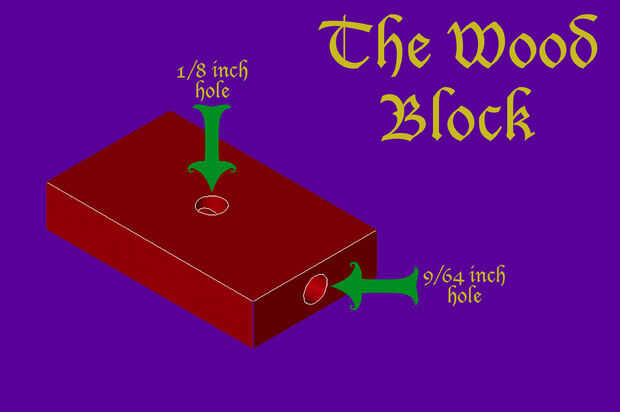 Primero, se corta un pedazo de madera de 1.25 x.25 x.75 pulgadas. Entonces, perfore un agujero con una broca de 1/8 pulgadas y otro agujero con una pulgadas 9/64 pedacito recto a través del centro de la manera que se muestra a continuación. En el orificio de 1/8 de pulgada, necesitará mover el taladro alrededor un poco para que sea ligeramente más grande que 1/8 de pulgada.